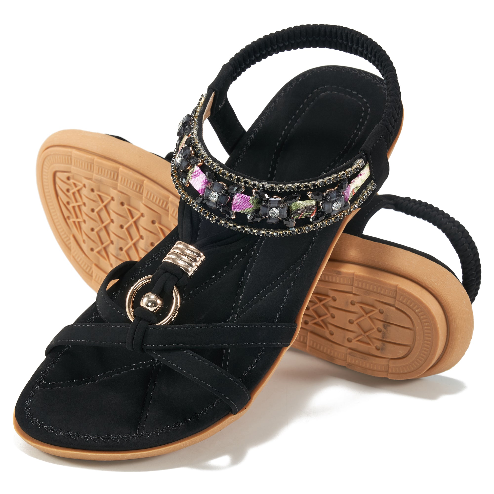 1.Stylish style-Flower beaded decorations, rhinestones,flat heels,open toe designsSandals women are comfortable and suitable enought for any dress or summer outfit, tops,shorts, jeans or leggings;