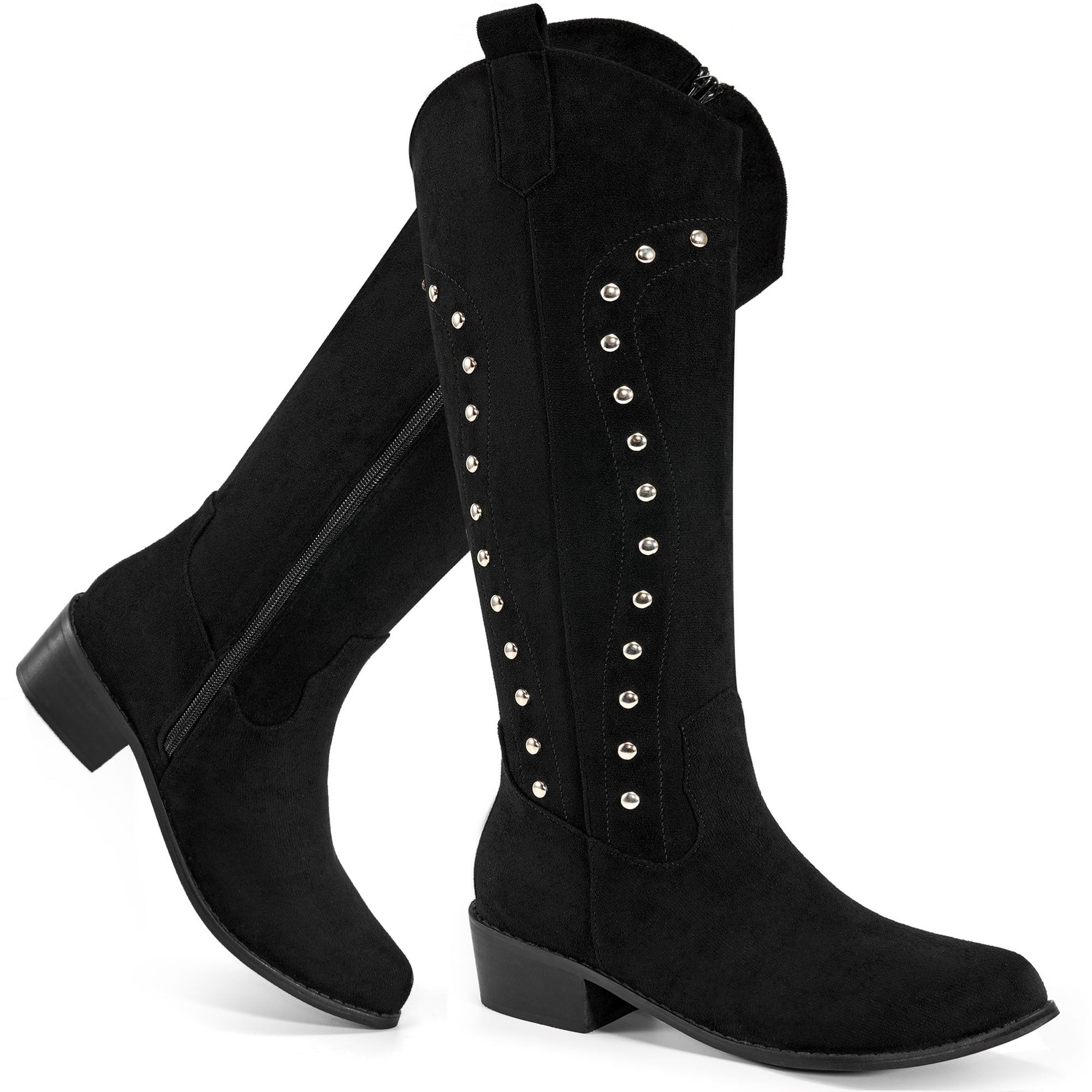 Premium Suede Upper with Wide Calf Boots:Crafted from soft, high-quality suede, womens boots feature sleek silver stud embellishments along the shaft for a bold, vintage-Western edge.