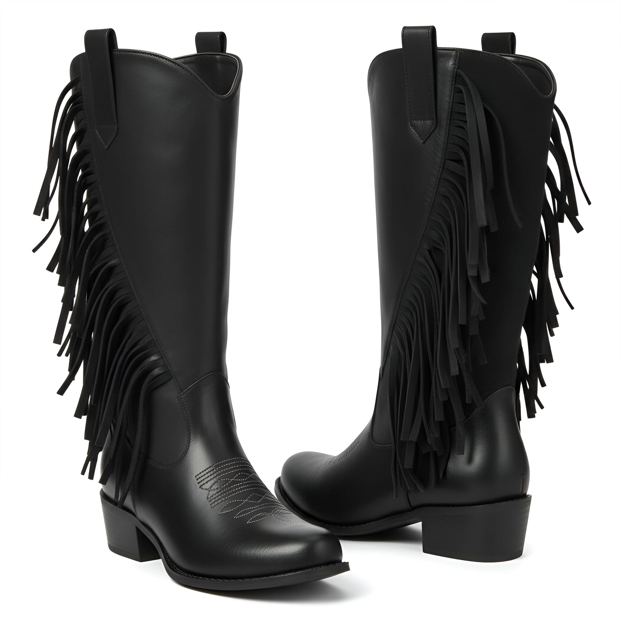 Classic Cowboy Design with Fringe Accents:Designed with a mid-calf shaft , rounded toe, and pull-on tabs for easy on/off, these boots blend traditional Western elements with modern flair. The flowing fringe sways with movement, adding iconic Western flair and tactile appeal.